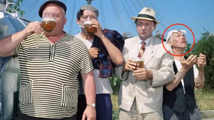 В «Кавказской пленнице» троица Трус-Балбес-Бывалый передаёт кружку пива. И по инерции Вицин суёт её внезапно появившемуся из кустов подвыпившему старичку. Помните этого дедулю? Кстати, его даже нет в титрах.