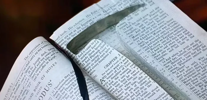Вырез сделан в книге Исход — той самой, где Моисей выводит еврейский народ из рабства в Египте. Это идеальная метафора: Энди, как Моисей, совершает свой побег из плена. Его инструмент спрятан в истории о свободе — ирония, достойная самого гениального плана.