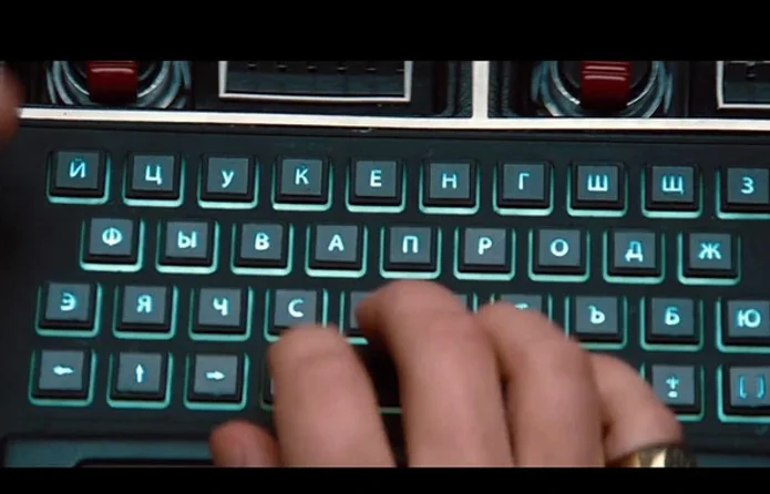 В фантастическом фильме "В плену космоса" на экране появляется странное слово "Вфтпук". Если набрать эти буквы на английской раскладке, получится вполне осмысленное предупреждение: "Danger Danger orbit deteriorating" ("Опасность! Ухудшение орбиты"). Подобная ошибка встречается и в бондиане "Из России с любовью", где на дверях написано загадочное "ДЕРГАТ" вместо привычных указателей "на себя/от себя".