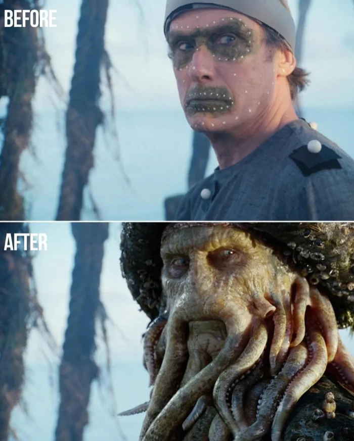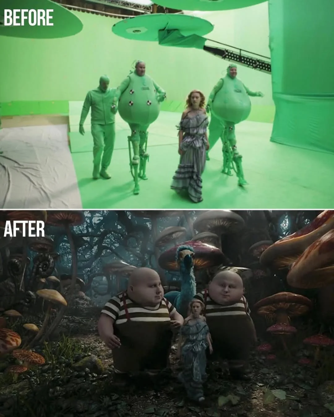 На съемках многие сцены выглядят на удивление просто и даже комично. Вместо грозных чудовищ — ярко-зеленые макеты, вместо фантастических пейзажей — однотонные фоны, а вместо эпичных сражений — пустые павильоны. Актерам приходится взаимодействовать с объектами, которых в реальности не существует, и представлять себе врагов, монстров или целые миры, которые появятся лишь спустя месяцы работы специалистов.