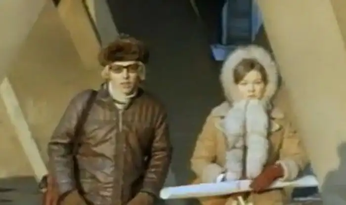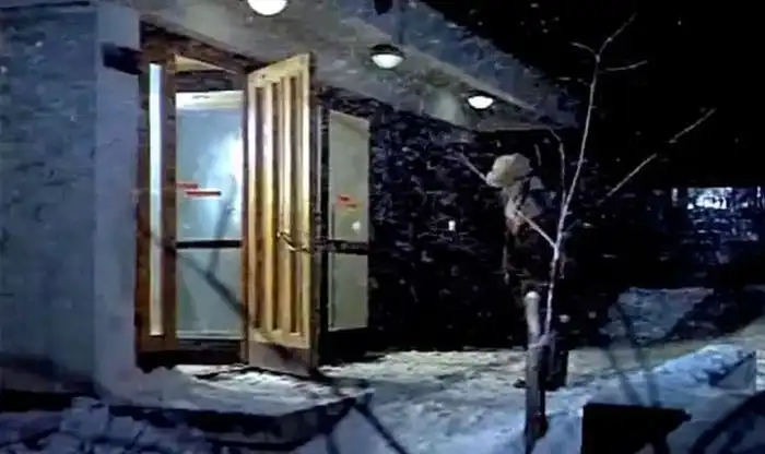 Кадр из фильма "Ирония судьбы, или С легким паром!". Женя Лукашин (Андрей Мягков) приплясывает от холода перед подъездом и придумывает повод вернуться в квартиру Нади.