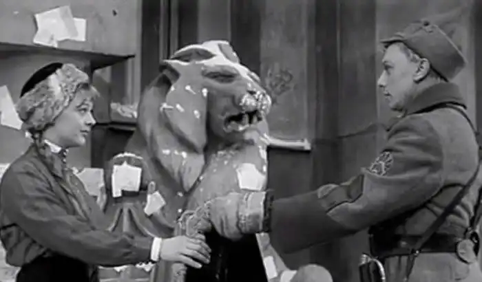 Кадр из фильма "Офицеры". Сцена знакомства главных героев Алексея и Любы. Дом со львами на улице Малая Молчановка.