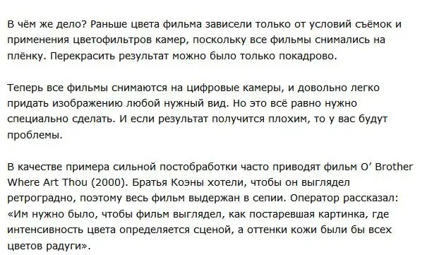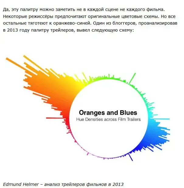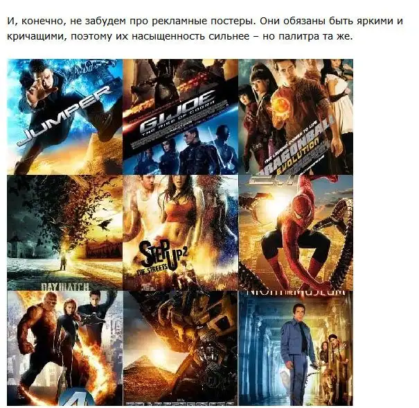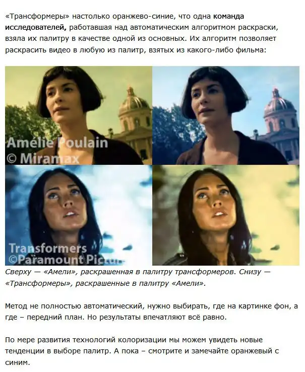 Последние два десятка лет голливудские фильмы переполнены оранжево-синей палитрой каритинок. Еще эту гамму цветов называют «оранжевой и зеленовато-голубой» или «янтарной и зеленовато-голубой». Вполне возможно, что вы этого не замечали, но взглянув на кадры из кинолент, которые представлены ниже, вы поймете, что это действительно так.