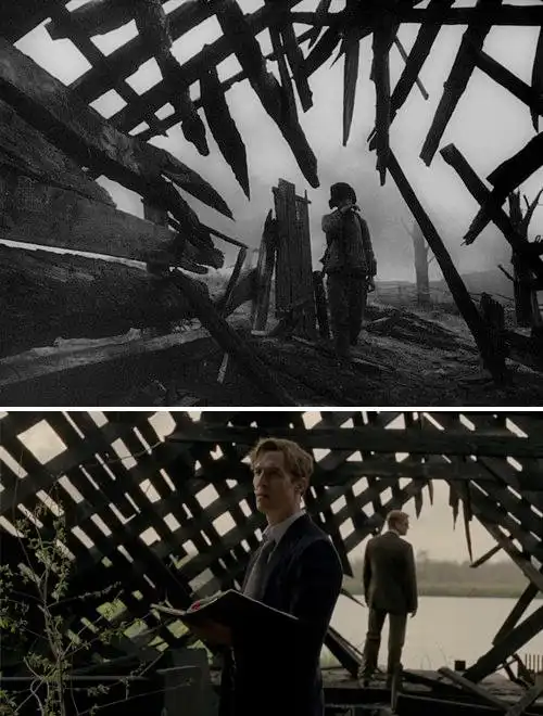 Андрей Тарковский. В начальной и заключительной сценах пилотного эпизода нашлись визуальные приветы творчеству Андрея Тарковского. Что символично, к первому и последнему его фильмам, но в обратном порядке. Дерево, под которым обнаруживают Дору Лэнг, — своеобразная аллюзия на дерево из «Жертвоприношения», а вот мизансцена в декорациях разрушенной церкви перекочевала в сериал из фильма «Иваново детство». То же самое дерево появится и в заключительной сцене «Детектива» — видимо, чтобы наглядно донести до нас мысль о том, что время — замкнутый круг.