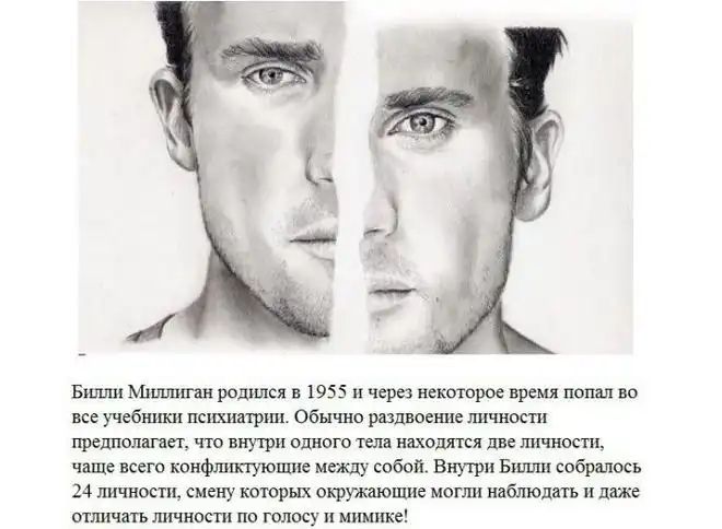 В голове Миллигана действительно было тесно. Среди персоналий, оккупировавших Билли, числились: мелкий мошенник Филип; наркоторговец Кевин, спланировавший ограбление аптеки; Эйприл, единственным желанием которой было убийство отчима Билли; стеснительная и одинокая лесбиянка Адалана, использовавшая тело Билли в изнасилованиях, что и привело к его аресту; восьмилетний «смотритель боли» Дэвид; англичанин Артур; «смотритель ярости» Рейджен, обладавший недюжинной силой; аферист Аллен; фокусник Томми и многие другие мужчины, женщины и дети.