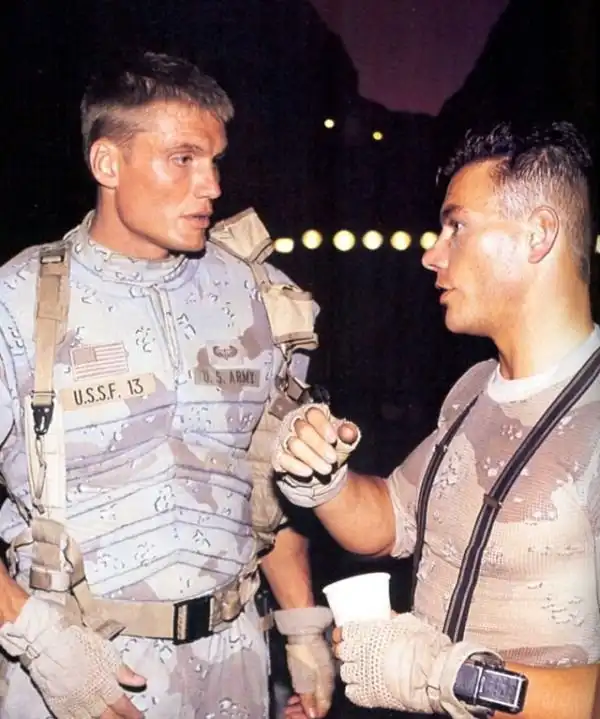 Жан-Клод Ван Дамм и Дольф Лундгрен на съемках фильма "Универсальный солдат".
