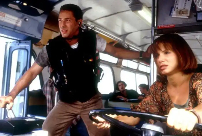 Представьте себе девушку, у которой на заднем стекле автомобиля красуется наклейка с восклицательным знаком, чайником и странного вида туфлей с подписью «уважай меня». Теперь представьте эту девушку за рулем гигантского американского автобуса, несущегося по городу на огромной скорости в час пик. Выглядит это довольно забавно, если не знать, что автобус заминирован и может взорваться, если стрелка спидометра опустится ниже пятидесяти миль в час.