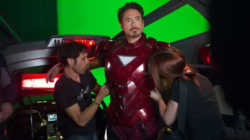 Тони Старк не нуждается в чьей-либо поддержке – ну, не считая поддержки Пеппер и Джарвиса. В фильме он самостоятельно справляется с костюмом – тот магическим образом идеально облепляет тело, стоит ему лишь протянуть руку. Но, как показывают закулисные фото, Тони Старку нужна помощь посторонних, чтобы облачиться в железную броню.