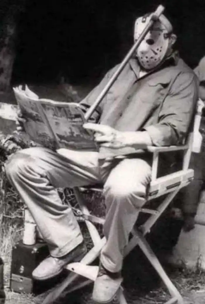 Ричард Брукер читает журнал в перерыве съемок сцены, где его персонажу всаживают в голову топор. Грим и реквизит готовы - можно и передохнуть перед работой!