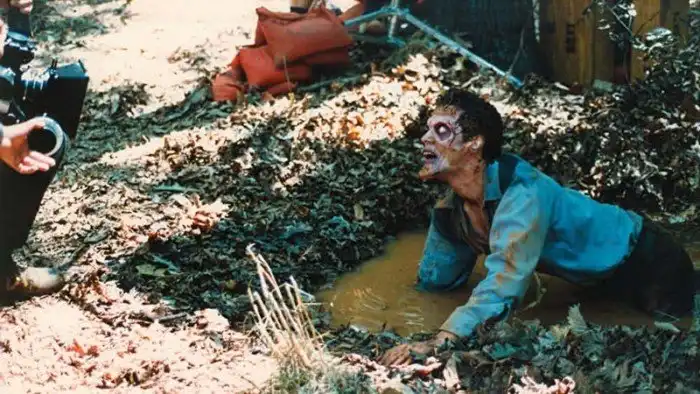 Исполнитель главной роли Брюс Кэмпбелл беседует с помощником режиссера. Самое смешное, что этот кадр практически в таком виде войдет в картину. "Зловещие мертвецы" вообще поставили рекорд по числу сцен, где в кадр случайно попадает микрофон, камера, администратор или еще какая-нибудь деталь съемочного процесса, которую зрителю видеть не полагается.