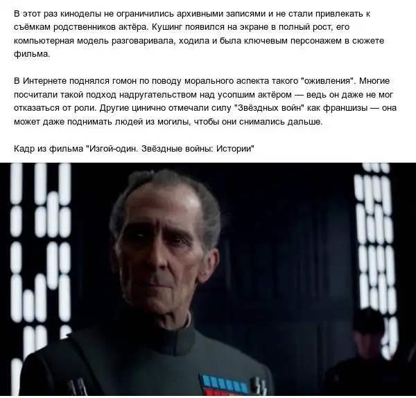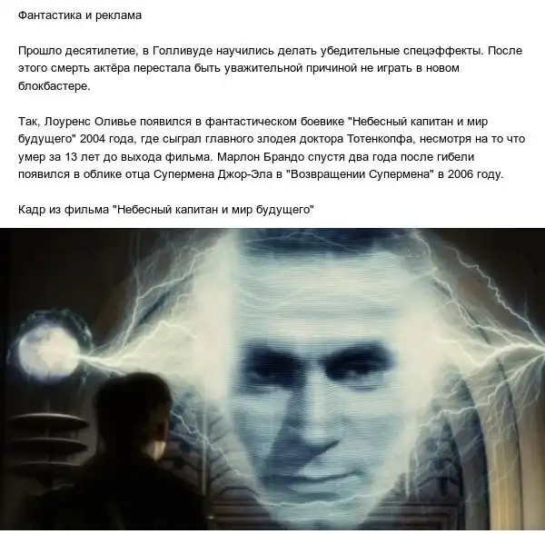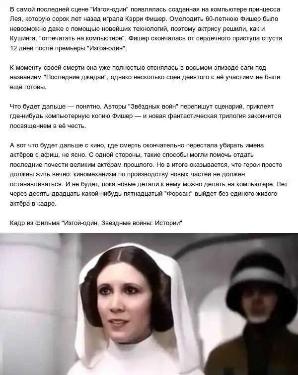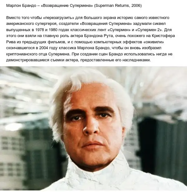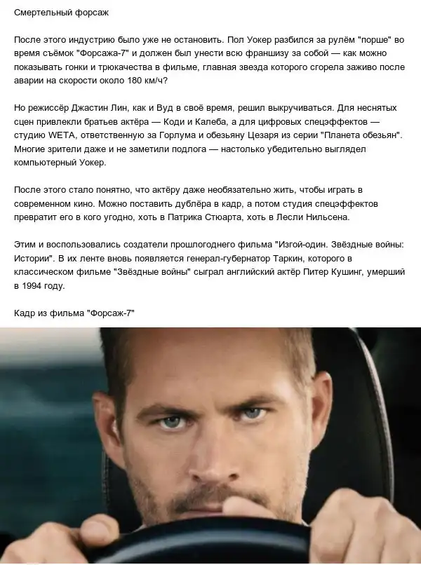 С развитием компьютерной анимации и графики, режиссеры все чаще и чаще прибегают к использованию компьютерных персонажей для съемок в кино. Конечно же, при помощи графики можно не только значительно омолодить актеров, которые снимаются в фильме, но и даже полностью заменить анимированными моделями уже умерших актеров, без которых продолжение кинофильма просто не возможно. Что самое интересное, снимать фильмы с компьютерными персонажами в большинстве случаев является даже гораздо дешевле, чем платить миллионные гонорары знаменитым актерам. А как вы относитесь к тому, что некоторые актеры продолжают "сниматься" в кино даже после своей смерти?