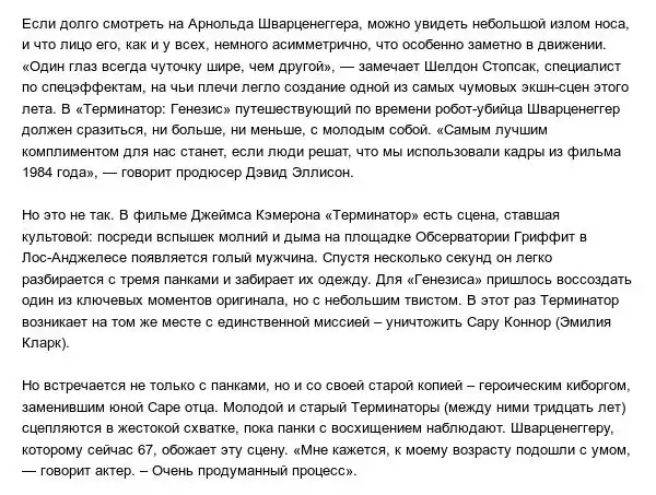 В вышедшем на экраны в 2015 году фильме «Терминатор: Генезис» мы могли наблюдать за компьютерной копией молодого Арнольда Шварценеггера. Тогда сходством были поражены многие, но мало кто догадывался о том, как создавалась копия известного актера. Рассказ о том, как все это происходило, ждет вас далее.