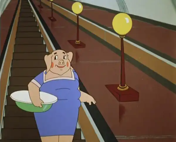 Таких примеров еще очень и очень много. «Ну, погоди!» чрезвычайно точно воспроизводит советский быт своего времени, отправляя зрителей в культовые места, можно сказать, на знакомство со скрепами. Как на экскурсию. Вот вам Спартакиада народов СССР, вот вам дом культуры, хотите колхоз с колодцем и уборкой урожая, — вот вам колхоз. А еще музей космонавтики (потому что космос — наша гордость), обязательно грандиозная социалистическая стройка, на которой Волк срывает производство, многоэтажка, бульдозер и даже круизный теплоход, который, почему-то, заплывает в воды кишащие акулами.