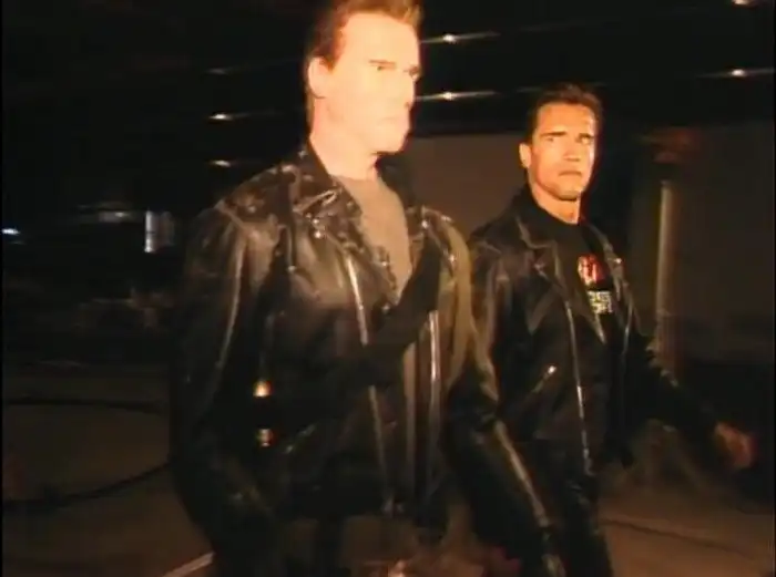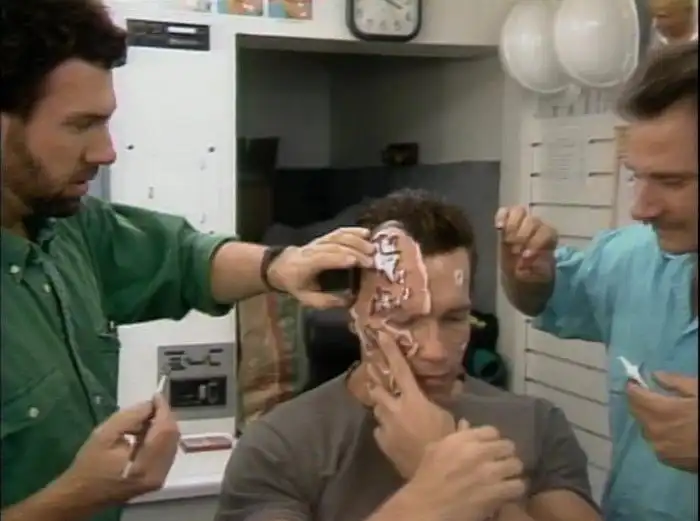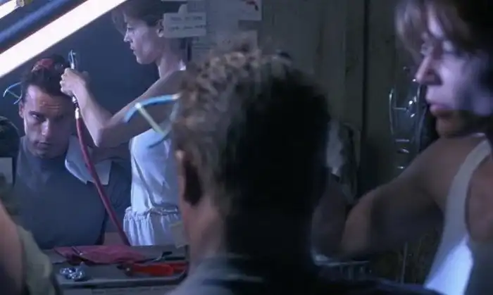 Сцена очень натуралистичная: заметно, как на переднем плане героиня смело ковыряется в голове Арни, отражение которого в зеркале при этом ведет себя как настоящий актер. Вся штука в том, что никакого зеркала нет, а «отражение» — и есть настоящий Шварценеггер, сидящий лицом к манекену. Как же быть с Линдой Хэмилтон, сыгравшей главную героиню? Уж она-то реальная что в одном случае, что в другом. На счастье съемочной группы, у актрисы есть сестра-близнец Лесли, именно она и повторяет движения Линды. Надо ли говорить, что на отработку синхронных движений у двух леди ушла уйма времени.