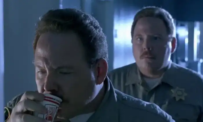 Помимо Лесли и Линды Хэмилтон, в «Судном дне» нашлось место еще парочке близнецов. Наверняка помните «психушку» и одного из ее охранников — пухлого мужчину, который любит выпить кофе. Принявший облик незадачливого толстяка Т-1000 с шизофреническим выражением лица — не плод спецэффектов, а родной брат актера. Вскоре здесь же видим очередной шикарный манекен — нанизанную на палец-лезвие голову бедняги.