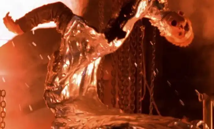 Финал снимали на настоящем заводе. Правда, было там далеко не так жарко, как это выглядит в фильме. Разумеется, ни о каком настоящем расплавленном металле не могло идти и речи. Вместо него съемочная группа использовала подсвеченную жижу из масла и сиропа. Необходимая тягучесть субстанции сохранялась только при температуре около пяти градусов, так что в помещении было холодно. Иллюзию жары пришлось создавать пульверизаторами с водой, которой брызгали на лица актеров.