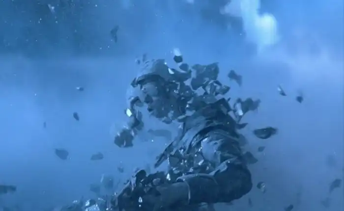 Четвертый манекен разлетается на мелкие кусочки, обнажая скелет. На остов куклы налепили куски папье-маше, после чего «сорвали» их с помощью специальной воздушной пушки, фиксируя все с помощью замедленной съемки. Получилось очень натуралистично.