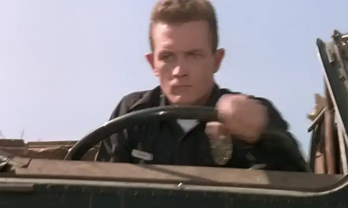 Режиссер был готов пойти на все, чтобы впечатлить зрителя, даже если речь идет о совсем крохотном эпизоде, который запросто можно в буквальном смысле проморгать. Заключительная четверть фильма, над «Кибердайн Системс» барражирует вертолет, Т-1000 запрыгивает в него с мотоцикла, разбивает стекло и перетекает в кабину, после чего металлическое воплощение киборга в течение какой-то секунды произносит в адрес пилота фразу «Get out».