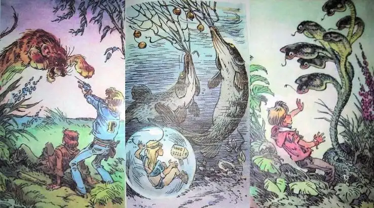 Склиссов тоже нашёл профессор Селезнёв, во время знаменитой экспедиции на «Пегасе». Тогда же были открыты и гигантские головасты с Арктура. Правда, с тех пор они выросли и вылупились. Можете посмотреть — вот они сидят на берегу пруда. Кто сказал «обычные лягушки»? Не обычные, а арктурианские! А с Пустой планеты профессор привёз животных-трансформеров. В зависимости от погоды они превращаются то в зверей, то в птиц, а то и в рыб.