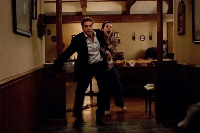 Завязка триллера Элая Рота «Кто там?» похожа на воплощение сокровенных мужских грез — семья главного героя оставила его в огромном доме одного, а с наступлением темноты в двери особняка стучатся две горячие девушки, промокшие с ног до головы.