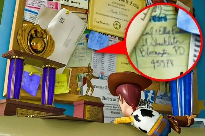 В одной из сцен «Истории игрушек» можно увидеть доску Энди с различными наградами, письмами и записками. Среди них есть открытка. Если приблизить, мы увидим на ней подпись от Карла и Элли Фредриксен (Carl and Ellie Fredricksen) из мультфильма «Вверх». Интересно, откуда они знают Энди?