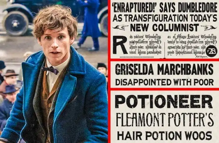 На протяжении фильма нам показывают два выпуска газеты: «Нью-йоркский призрак» и «Ежедневный пророк». Помимо сюжетных заголовков про Гриндевальда, тут мелькает имя Флимонт Поттер (дедушка Гарри Поттера). Заголовок про напряженную ситуацию в Хогвартсе, когда Волдеморт там учился. А также статьи про Дамблдора и Гризельду.