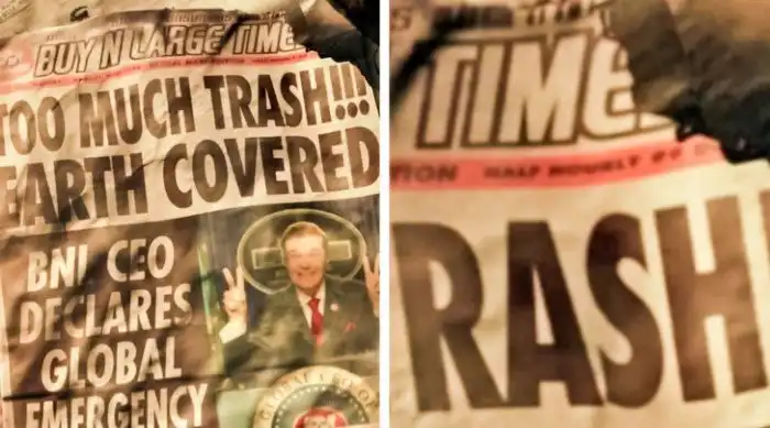 В начале фильма нам показывают газету BUY N LARGE TIME, из которой мы понимаем, что Земля погрязла в мусоре. Но если приблизить изображение, то рядом с крупным заголовком можно увидеть надпись half-hourly («получасовой выпуск»). Это означает, что сама газета выпускалась каждые полчаса и была одной из причин загрязнения Земли.