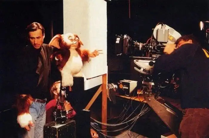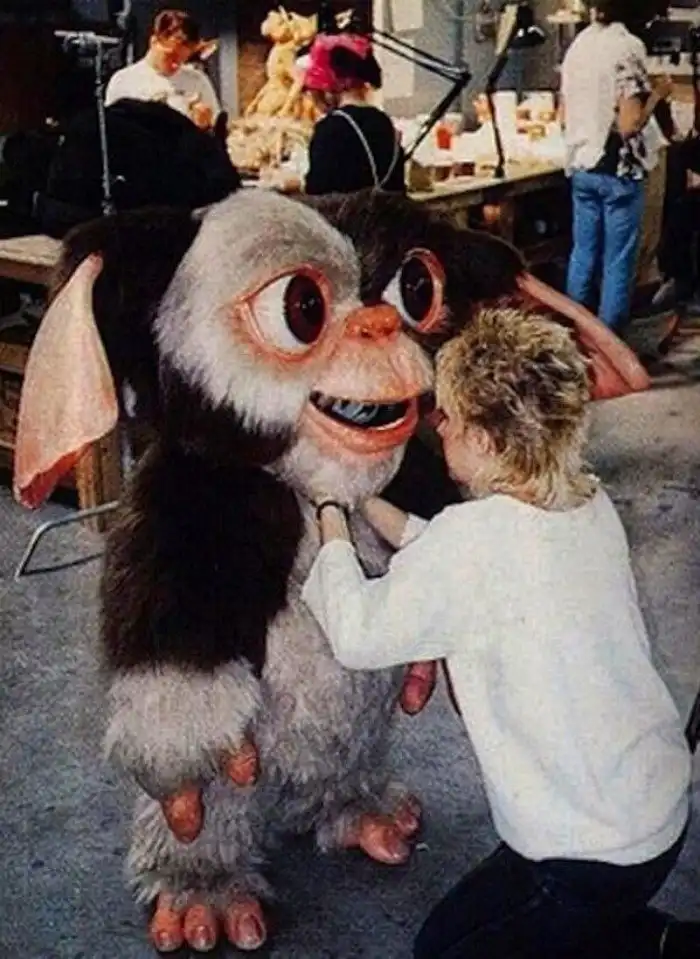 Примерно так выглядели съёмки каждой сцены с участием Гизмо и его родственников. Куклой управляло сразу столько народу, что теперь мы понимаем, почему почти в каждой сцене персонажи-люди в кадре обрезаны по пояс.