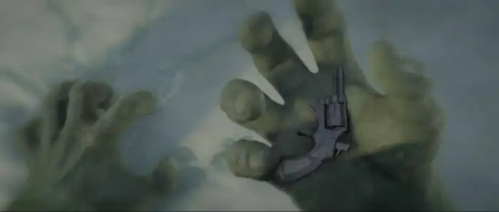 В этой сцене Брюс собирается спустить курок, прежде чем превратится в Халка и сломает пистолет. Это не самая подходящая для семейного просмотра сцена. И, вероятно, поэтому она была вырезана.
