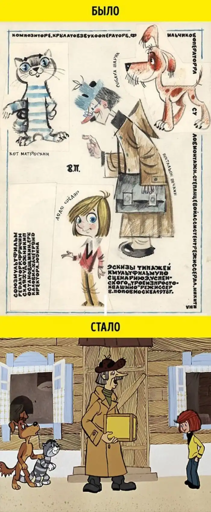 Над персонажами мультфильма последовательно работали три разных человека. Первую серию рисовал художник студии «Союзмультфильм» Николай Ерыкалов. Вторую часть мультика «оживлял» преимущественно карикатурист Левон Хачатрян. А дядю Федора для второй и третьей серии создавал Аркадий Шер. Поэтому персонажи не только отличаются от своих прототипов с первых эскизов, но и немного меняются от серии к серии.