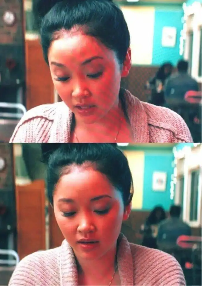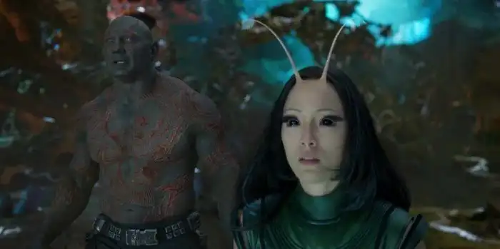 В кадре на первом фото глаза Мантис почему-то забыли обработать, как в остальных сценах фильма.