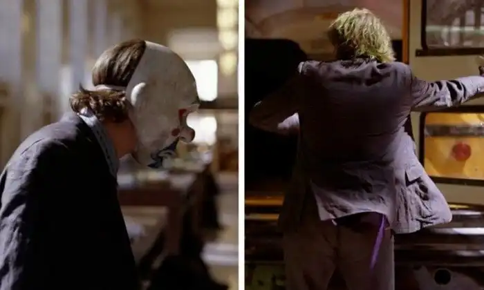 В первой сцене Джокер, находясь в маске, очевидно был обладателем темно-русых волос, но минуту спустя уже запрыгивал в автобус со своими зелёно-джокерскими локонами.