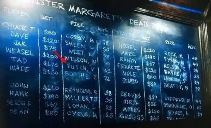 На доске в любимом баре Дэдпула под ставками в «Dead Poll» есть куча занимательных имен: Владимир Путин, Райан Рейнольдс, Ти Джей Миллер, Майли Сайрус, Билл Косби, Чарли Шин
