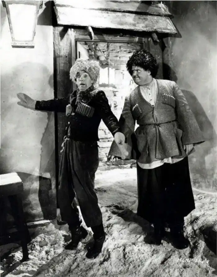 А этот нашумевший кадр - всего лишь фото со съёмок, на котором рядом с Дорелом и Харди встал актёр, исполнявший роль Егора, главного героя - Лоуренс Тиббетт. По сути, это фото, как если бы с Бывалым и Балбесом стоял Шурик. И общее в этих героях - только кавказские наряды