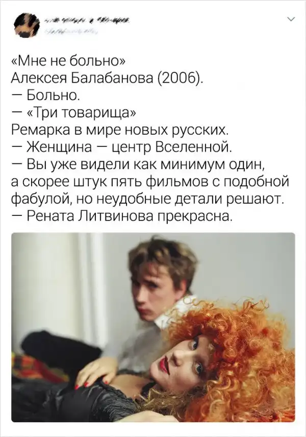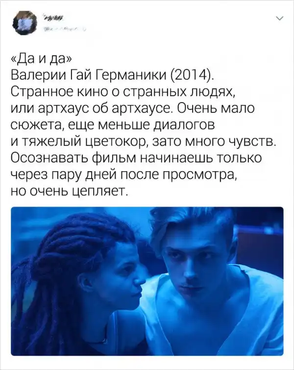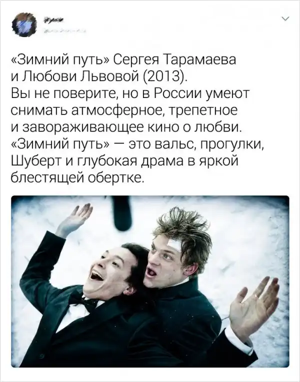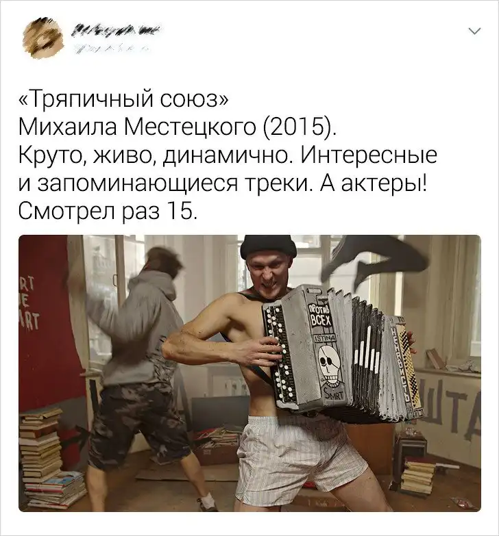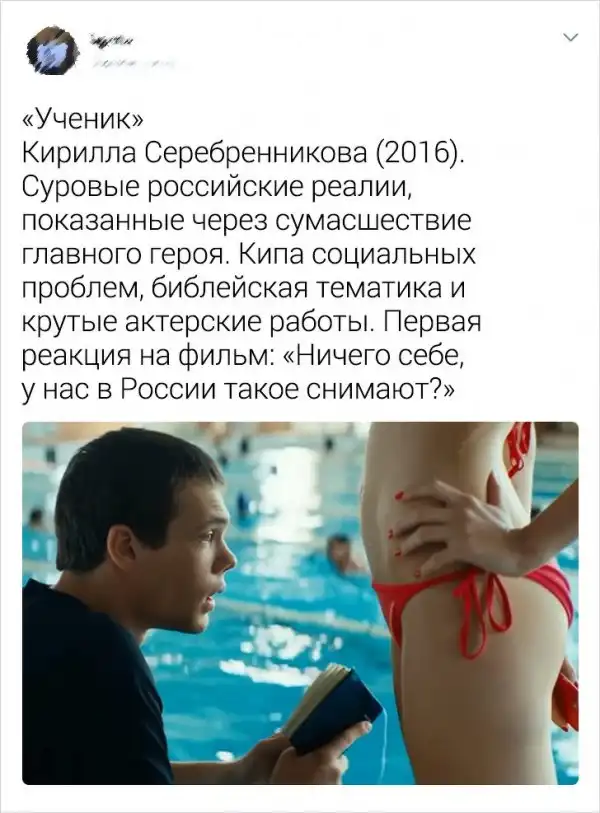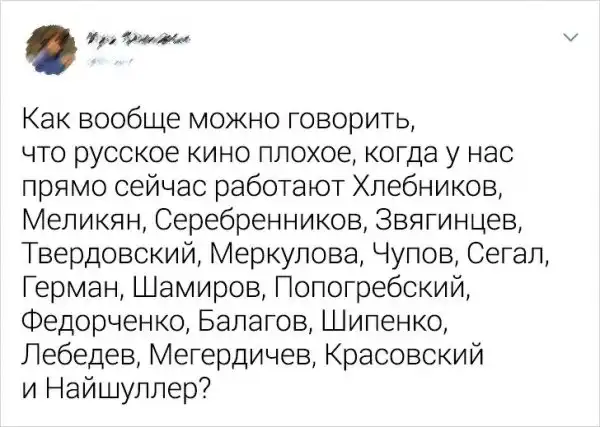Пользователям Twitter надоело, что все критикуют русские фильмы. Дескать, если картину снимали в России, то ее даже смотреть не стоит. И решили опровергнуть этот стереотип, собрав подборку фильмов, просмотр которых приносит удовольствие. Ну, или другие яркие эмоции.
