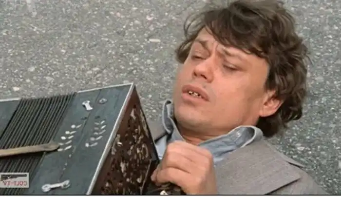 Но вот он идет, посвистывая по новому асфальту – младшенький Василий (Н. Караченцов), с гармошкой: «У людей сплошные свадьбы, у меня – сплошной развод».