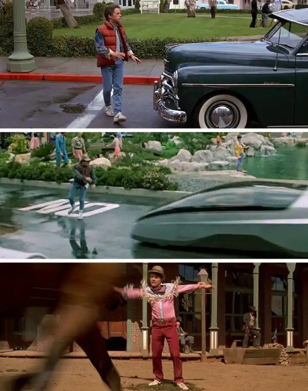 В трилогии "Назад в будущее" Марти чуть не сбивают всякий раз, когда он впервые оказывается на площади возле суда.