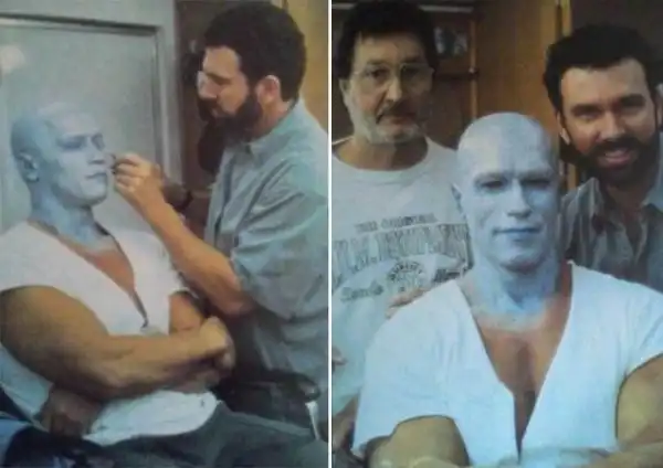 Арнольду Шварценеггеру наносят грим для роли Мистера Фриза в фильме «Бэтмен и Робин», 1997 год