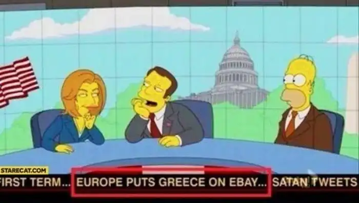 Новости о дефолте в Греции с объявлением "Европа выставляет Грецию на ebay" появились в "Симпсонах" в 2013 году. А в 2015-м Греция действительно объявила дефолт - но, к счастью, продажи с аукциона избежала.