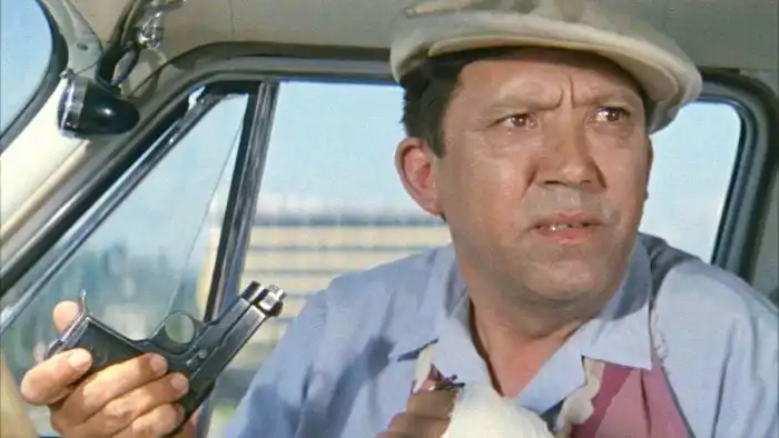 В кадре, когда жена Семён Семёныча после вечеринки в ресторане «Плакучая Ива» роняет пистолет на пол, на рукояти видны латинские буквы «PB» – то есть «Пьетро Беретта».