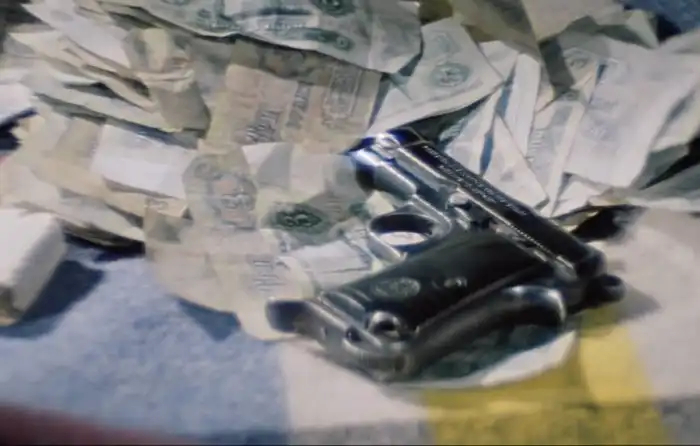Но в кадре – явно другой пистолет, с «квадратным носом» затвора и слегка выпирающим стволом – не похоже на изящный зализанный силуэт «Макарова». Да и на рукояти у пистолета в фильме зацеп, которого у ПМ никогда не было: