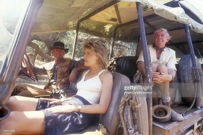 Пол Хоган, Линда Козловски и Джон Майллон на съёмках фильма "Данди по прозвищу Крокодил