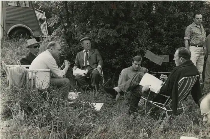 Бурвиль, Луи де Фюнес, Жерар Ури со съёмочной группой на съёмках фильма "Большая прогулка"