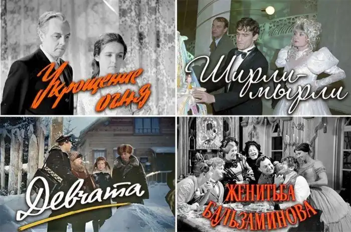 13. Съемки художественного фильма "Девчата" к/ст "Мосфильм" (реж. Ю.С. Чулюкин), слева направо: Н.Н. Погодин (Саша-гармонист), Л.И. Овчинникова ( Катя), Н.В. Румянцева (Тося Кислицина), Н.Н. Рыбников (Илья Ковригин). Авторы съемки: Мерцедин О.А., Пермска