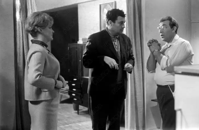 8. Рабочий момент съемки кинокомедии "Бриллиантовая рука" на киностудии "Мосфильм"; слева направо: режиссер-постановщик Л. Гайдай, актеры Ю. Никулин, А. Папанов. Автор съемки: В. Мастюков, ТАСС. Москва, 1968 г.
