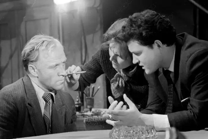 4. Артист М. Ульянов, режиссер-постановщик А. Салтыков, гримёр перед съемкой фильма "Председатель" на киностудии "Мосфильм". Автор съемки: В. Мастюков, ТАСС, 1964 г.