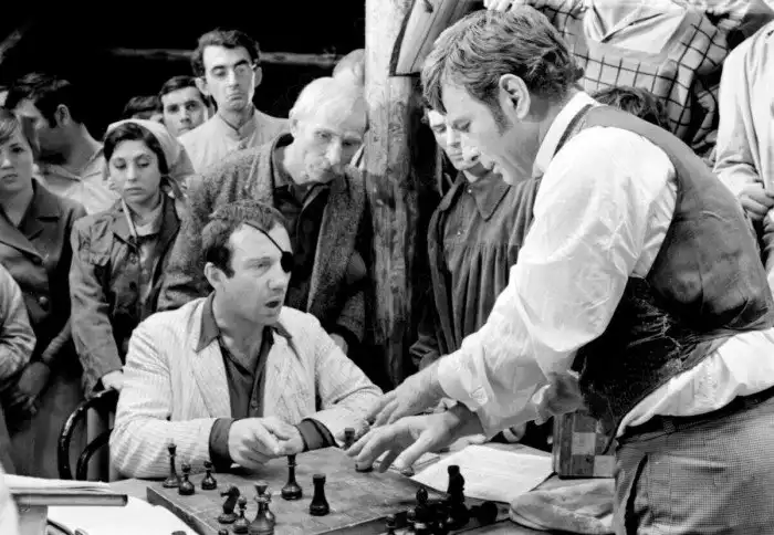 9. Рабочий момент съемки кинокомедии "Двенадцать стульев" на киностудии "Мосфильм"; в ролях: Остап Бендер - артист А. Гомиашвили, одноглазый шахматист - артист С. Крамаров. Автор съемки: А. Коньков, 1970 г.