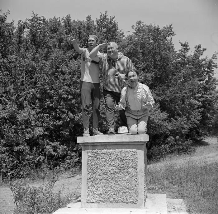 18. Заслуженный артист РСФСР Ю.В. Никулин, актер Е.А. Моргунов и заслуженный артист РСФСР Г.М. Вицин позируют стоя на постаменте между съемками фильма "Кавказская пленница", Крым, 1966 г.