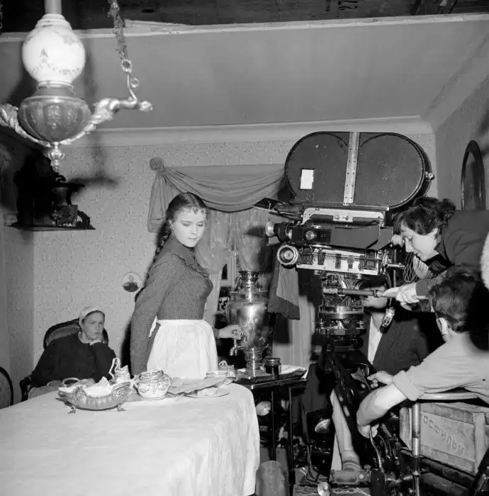 19. Актриса Т.П. Семина в роли Катюши Масловой, оператор Э.М. Савельева и другие во время съемок фильма режиссера М.А. Швейцера "Воскресение", Россия, 1960-1962г
