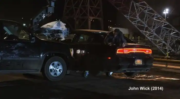 15. Съёмки сцены, в которой одна машина врезается в бок другой, из фильма «Джон Уик» (2014)